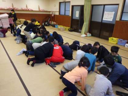 合同の朝の集いの後、60畳の部屋に戻り、御室小学校だけの朝の集いをしました。健康観察や今日の予定の確認をしました。