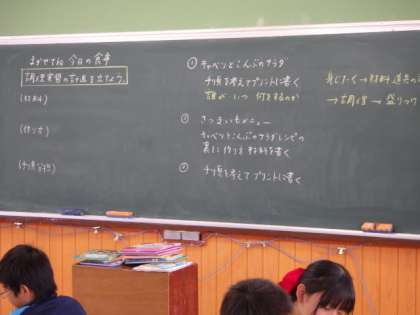 10月17日(木)6年1組の家庭科は,「まかせてね 今日の食事」という学習をしました。調理実習の計画を立てました。(材料)(作り方)(手順分担)などを考えました。