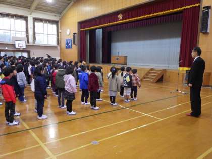 校歌を歌った後,学校長の話がありました。年末の紅白歌合戦で竹内マリアさんが,歌われた「いのちの歌」についてでした。みんなも,学習発表会で歌った曲でした。その曲が学校長の好きな曲で,歌詞について,感想を述べました。