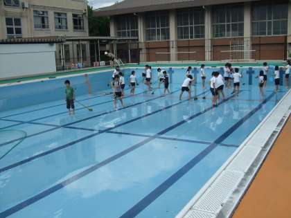 本日5校時目から6年生がプール掃除をしました。泥臭い匂いの漂うプール内をみんなで協力してきれいにしています。来週から,みずあそび・水泳学習が始まります。