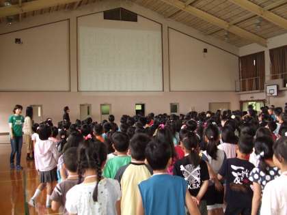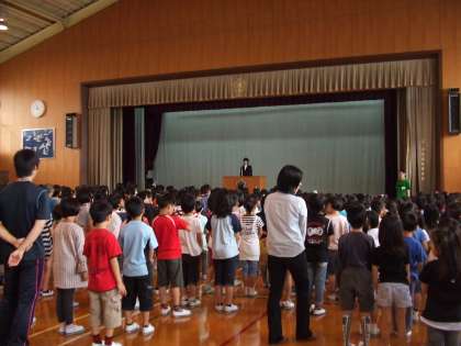 本日,6月の朝会がありました。今日から24日(金)までの「教育実習生の挨拶」がありました。次に,4〜5月のオムロソングである「校歌」と「京都市歌」を全校でうたいました。高い音がきれいに響いていました。その後,5年生の群読「きりなしうた」を聞きました。低学年の児童にもわかりやすくとってもおもしろい詩でした。最後に,「あいうえおであそぼう」を全校みんなで群読しました。初めての取組でしたが,子どもたちは大変楽しんでいました。