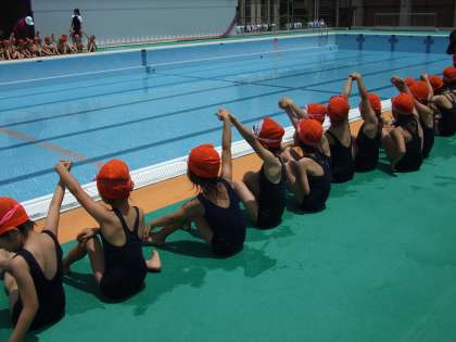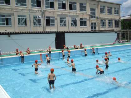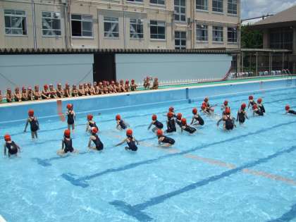 今日は1年生が初めて学校のプールに入る日です。友達と二人組み(バディ)を作ってお互いを確認しあったり,アドバイスをしあったりして学習を進めていきます。今日は低水位での水なれなので,簡単な運動で楽しみました。