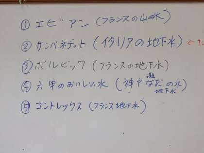 5種類の水を口に含み,利き水です。5種類とも全く味は違います。飲んでみた感想をメモしています。どの水がお気に入りかな?