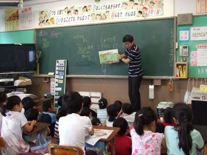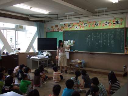 年間9回,朝の読書の時間に教員が自分の学年以外の教室に行き,読み聞かせをします。今日は,1〜3年の教室で行われました。