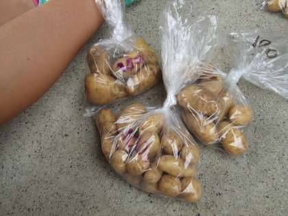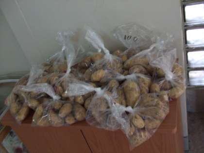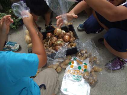 先日収穫した,たまねぎとジャガイモを袋詰めして,販売します。職員室前に並べました。ぜひ,お立ち寄りください。