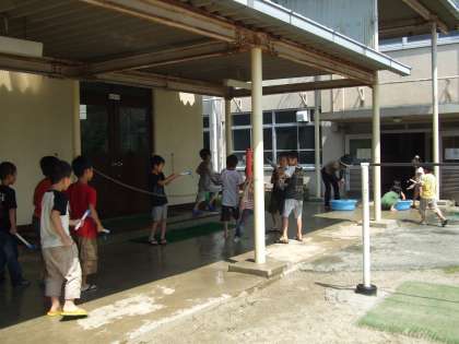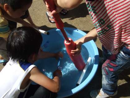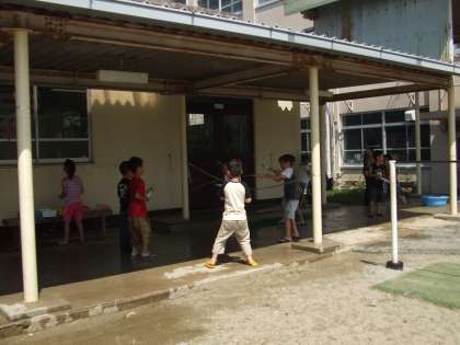 みずでっぽうであそびました。体じゅう水浸し,でも気持ちいい。