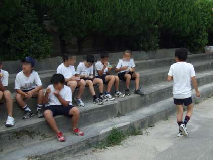 運動場の草引き。そして,気持ちのいいプールとおいしいおやつです。楽しいね。