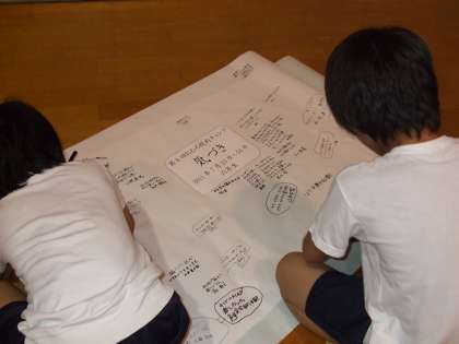 キャンプファイヤー終了後自由な時間です。寄せ書きを書いたりお化け屋敷へいったりしました。そして,夜食が配られました。おにぎりと「おやじの会」特製の焼きそばです。みんなもりもりと食べています。