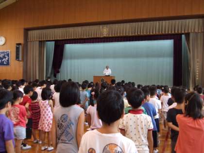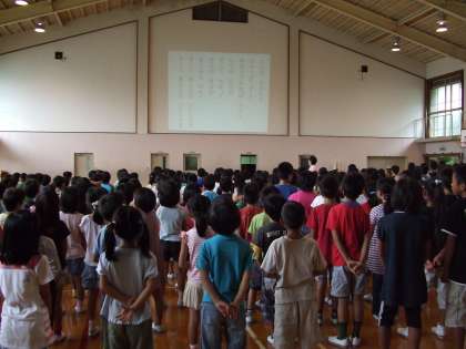 9月の朝会がありました。始めに校長先生のお話です。次に,転入生の紹介がありました。最後に,オムロソングの2部合唱です。