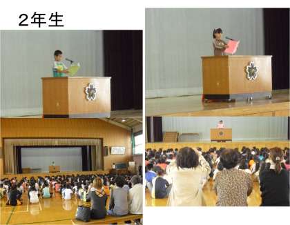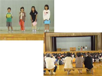 2年生,3年生各2名づつの発表がありました。今回は,運動会の練習で苦労した事,励まされて勇気がわいた事,また,運動会当日に頑張った事や他学年の競技や演技を見て心が打たれた事などを,それぞれが堂々と心を込めて発表しました。