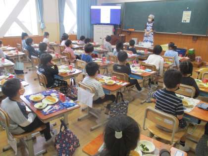 配膳は,まだ先生にしてもらいますが,今日のメニューはミートスパゲティでした。