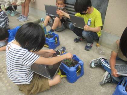 先週,一人一鉢ミニトマトを植えました。自分たちで育てる初めての野菜です。今日はミニトマトの苗の観察を行いました。色や葉っぱの大きさ,形,においなどを自分で触ったり,パソコンで撮ったりしながら観察しました。