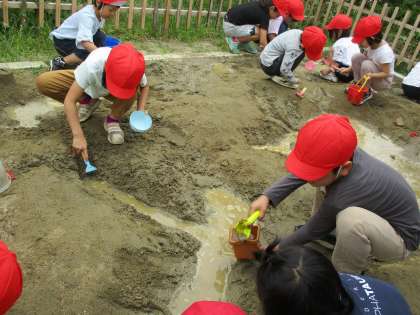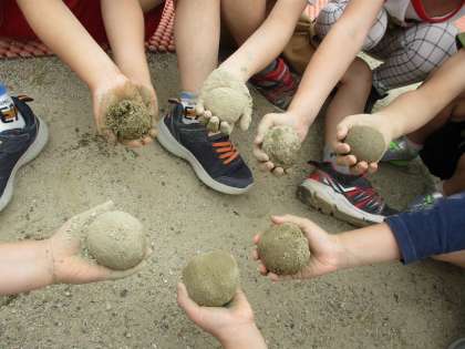 友だちと協力して穴を掘ったり,水を流して道をつなげてみたりしました。また,泥団子もさらさらの団子を作ったり,おおきな団子を作ってみたりして,砂と仲良しになりながら楽しみました。