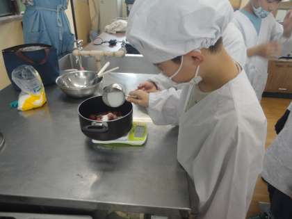 水曜日にお楽しみ会をしました。今回は,さくらんぼ学級の畑で育てたイチゴでジャムをつくり,ホットケーキにつけて食べました。みんなで交代しながら量ったり混ぜたり焼いたり・・・協力して作ることができました。自分たちで育てたイチゴで作ったジャムはとてもおいしくみんな大満足でした。