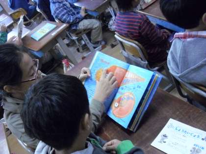 高学年から低学年に読聞かせをしてあげます。読んであげる本が決まったら本の題名を書いたカードをわたして題名を知らせておきます。