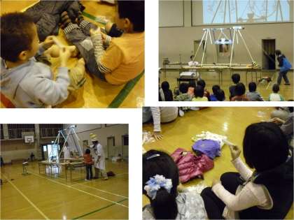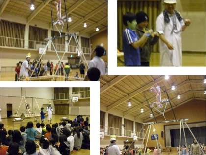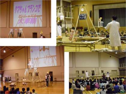 体育館で科学実験教室がかいさいされました。100名近くの児童と保護者が参加し,ふりこやブランコの動く秘密を考えながら,「クマちゃんブランコ大車輪」ショーを楽しみました。