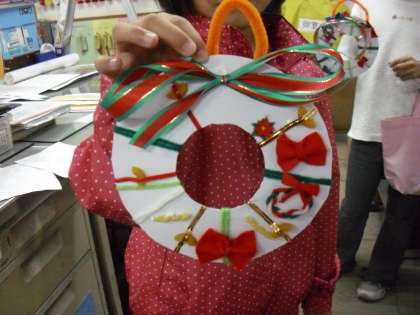 PTA主催の「クリスマスグッズ」作りが開催されました。きれいな,かわいいリースができあがりました。