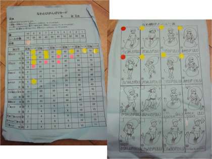 なわとびがんばりカードで今できる跳び方で多くの回数に挑戦したり,新しい跳び方に挑戦したりしています。