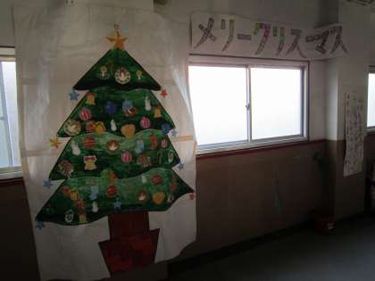 学習発表会の時の,3年生の舞台の背景に飾っていた,「クリスマスツリーの絵」と「メリークリスマスの言葉」,そして,「3年生のめくり」の3つを3年生の教室前廊下に飾っています。