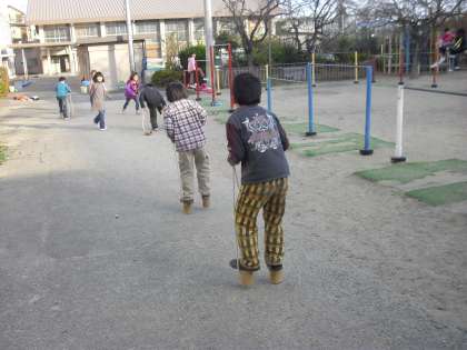 竹ぽっくりで追いかけています。なかなか追いつきません。