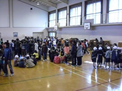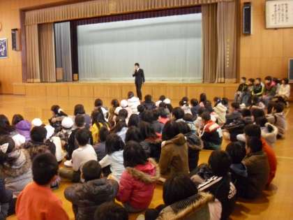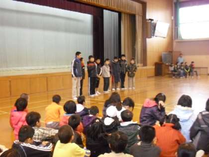 1月は環境・図書・運動・飼育委員会からのお知らせを聞きました。その後,集会委員会のゲーム「もうじゅうがりに行こうよ」を楽しみました。最後に学校現場研修に来ています大学生の紹介がありました。