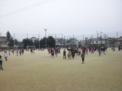 1月の月曜日は「シャトルラン」です。全校で運動場を行ったり来たりしています。