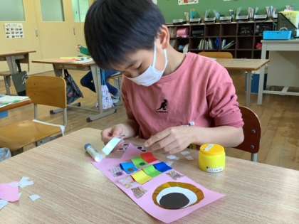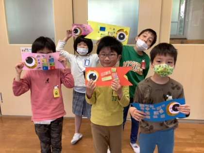こいのぼりの由来などについて話を聞いたあと、自分の好きな色の画用紙やうろこになる折り紙を選びました。同じ作り方をしていてもひとつひとつ違うとてもかわいいこいのぼりができました。