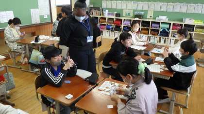 写真は、外国語の学習の様子です。ALTのリサ先生と共に、友達の名前を英語で尋ね合っているところです。チャンツの中で、英語で相手の名前を尋ねる言い方を学んだり、アルファベットを並べながら名前のつづりを確認したりしました。