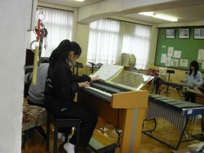 土曜日の早朝の音楽室の風景です。鼓笛バンドフェスタに向けて頑張っています。