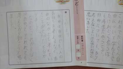 道徳では「ほんとうのことだけれど」を通して自由と責任について考えました。自由すぎて責任を忘れてもいけないし、責任ばっかりで自由がないとおもしろくないし、自由と責任のバランスを考えて過ごせると良いなという感想をもった子どもがいました。