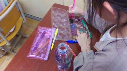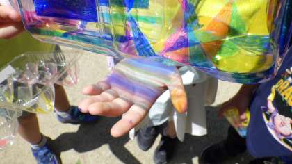 2年図画工作科の「ひかりのプレゼント」の学習では、透明の材料に油性ペンで色をぬり、太陽のひかりを通していろいろな色や形を見つけました。