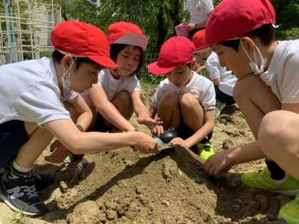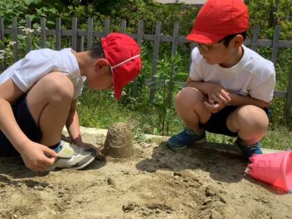 まずは乾いた砂場を掘ったり山をつくったり、それぞれに遊び始めました。途中からは水を使っての「泥遊び」に。「ドロドロになってる」と泥の感触を楽しんで泥だんご作りをしたり、作った山から水を流して川を作ったり、気が付くとみんなで一緒に協力して活動する様子が見られました。