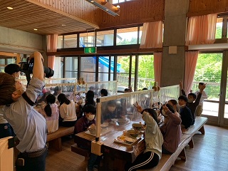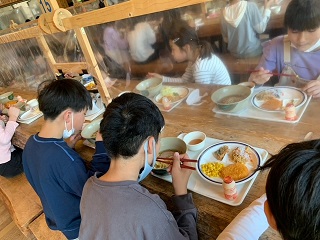 花背山の家の食堂にて、午後からの活動に向けて、昼食をとっています。