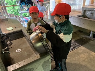 野外炊事の後片付けも、協力しながら、きれいに元通りにしています。