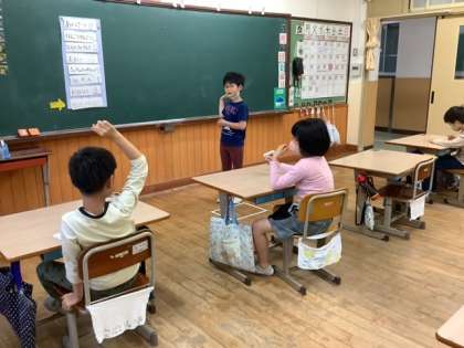 朝の会での司会やスピーチが上手になってきました。みんなに聞こえる声で話すことを意識したり、「スピーチをしたい」と手を挙げる子が増えたり、毎日繰り返す中で自信をもって話す姿が見られるようになってきました。友達の発表を最後まで聞くこともできるようになってきています。