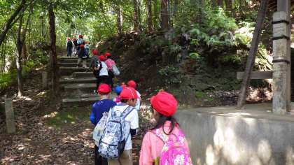社会科の学習で、京都市の様子を調べるために、御室八十八か所に登りました。頂上まで一生懸命に登り、みんなで頂上から京都市の様子を見ることが出来ました。方位磁針で方位を確認しながら、色々なことに気付くことが出来ました。これからの学習に活かしていきたいと思います。