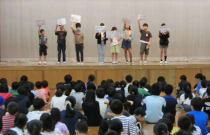 12日(月)1時間目にオムロワールドがありました。各委員会からのお知らせのあと、全校で校歌で歌いました。その後、6月の「友だちの日」の取り組みで、3組について、3組担当の先生からのお話を聞きました。