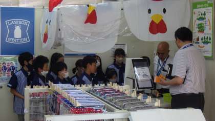 実際の店内へ移動し、挨拶の仕方、レジ打ち方などを、店員さんとお客様とに分かれて練習しました。