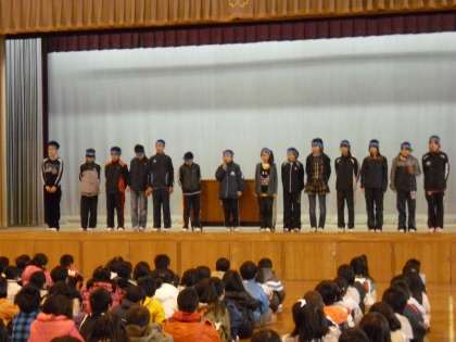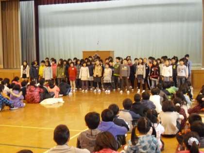 本日朝会がありました。校長先生のお話の後,大文字駅伝大会に出場する選手から「応援お願いします。」とあいさつがありました。その後,3年生の「はやくちうた」の群読発表がありました。大きく口を開け,しっかり,丁寧に言えていました。そして,全校朝会群読でした。今日は「早口ことばのうた」を楽しみました。
