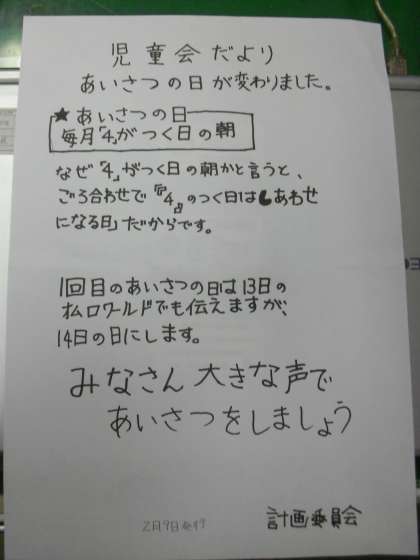 あいさつの日が変わりました。毎月「4」のつく日の朝になりました。