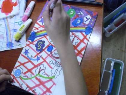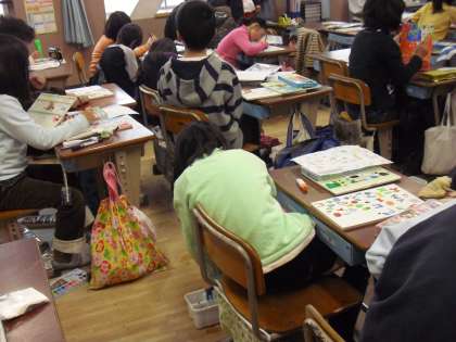 3年は「くぎうちゲーム」を作っています。今日は台の色つけです。丁寧に取り組んでいます。
