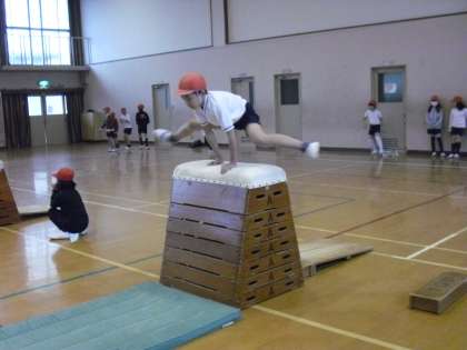 3年生は体育の授業で「とびばこ運動」をしています。たて向き,横向きの跳び箱で「開脚跳び」「かかえ込み跳び」「台上前転」などの跳びこし方で高さに挑戦しています。