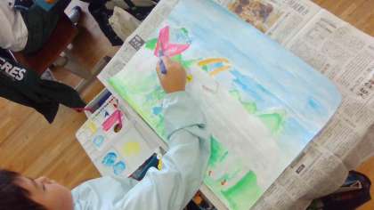 図画工作科の学習で、選定図書を読んで、場面を想像し、絵に表しました。背景や登場人物によって、絵の具の使い方を工夫しながら、描きました。