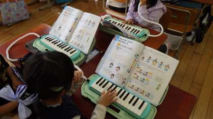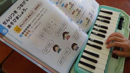 子どもたちは、指使いに気を付けながらきれいな音が奏でられるよう、友だちと協力して何度も練習していました。