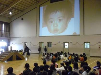 卒業生入場で始まり,プロローグでクス玉割,全校合唱「大切なもの」を歌いました。