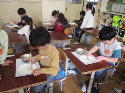 正しいお箸の使い方で、30秒間で何個豆を皿に移せるか競います。