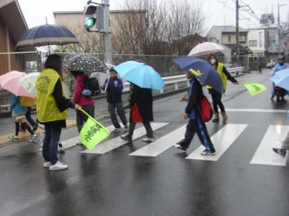 最後の日,雨になりましたがPTAの皆様の見守りのもと,新班長先頭に登校しています。