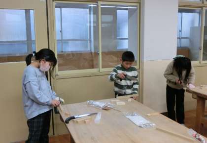 のこぎりの使い方を教えていただき、安全に気をつけて、木を切りました。初めてのこぎりを使う子もいて、緊張しながら使っていました。