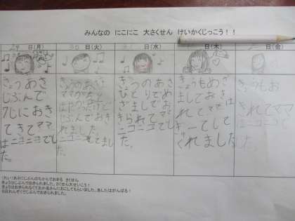 生活科「みんなの にこにこ 大さくせん」の学習で、お家の人をにこにこにするための作戦を立てて1週間実行しました。