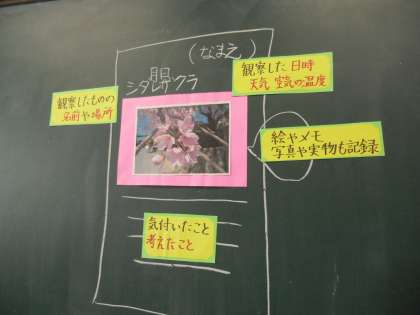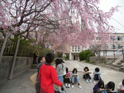 今日は理科の学習「季節と生き物」でシダレザクラを観察しました。